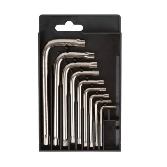 Набор ключей состоит из девяти предметов. Каждый ключ выполнен из хромованадиевой стали и имеет наконечник в виде звездочки. Данные инструменты обладают высокой прочностью и прослужат долгие годы.