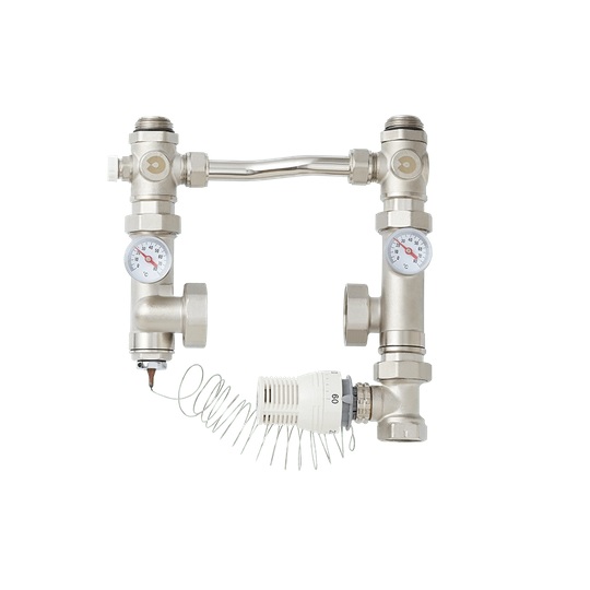 Насосно-смесительный узел применяется в системах отопления зданий и предназначен для поддержания заданной пользователем температуры и расхода теплоносителя в системах водяного подогрева пола. Узел оснащён термостатическим клапаном и термоголовкой с выносным погружным датчиком, которые обеспечивают плавное и непрерывное регулирование расхода и температуры в системе. Узел может эксплуатироваться совместно с циркуляционными насосами различной мощности, имеющими монтажную длину 130 мм и присоединительную резьбу G1½.