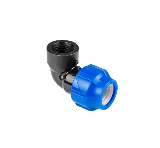 Отвод с внутренней резьбой, для соединения двух полиэтиленовых труб при монтаже водоснабжения.
